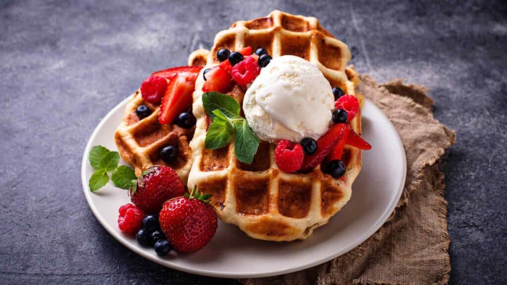 วาฟเฟิลเนื้อบาง เบา กรอบนอกนุ่มใน เพราะใช้ยีสต์ทำให้แป้งฟู นิยมโรยด้วยน้ำตาลไอซิ่ง เสิร์ฟคู่กับวิปครีมหรือผลไม้สด กัดแล้วกรอบกริบ หอมละมุน ละลายทันทีในปาก เหมาะกับคนที่ชอบ ขนมหวานเบา ๆ แต่หรูหราสไตล์ยุโรป