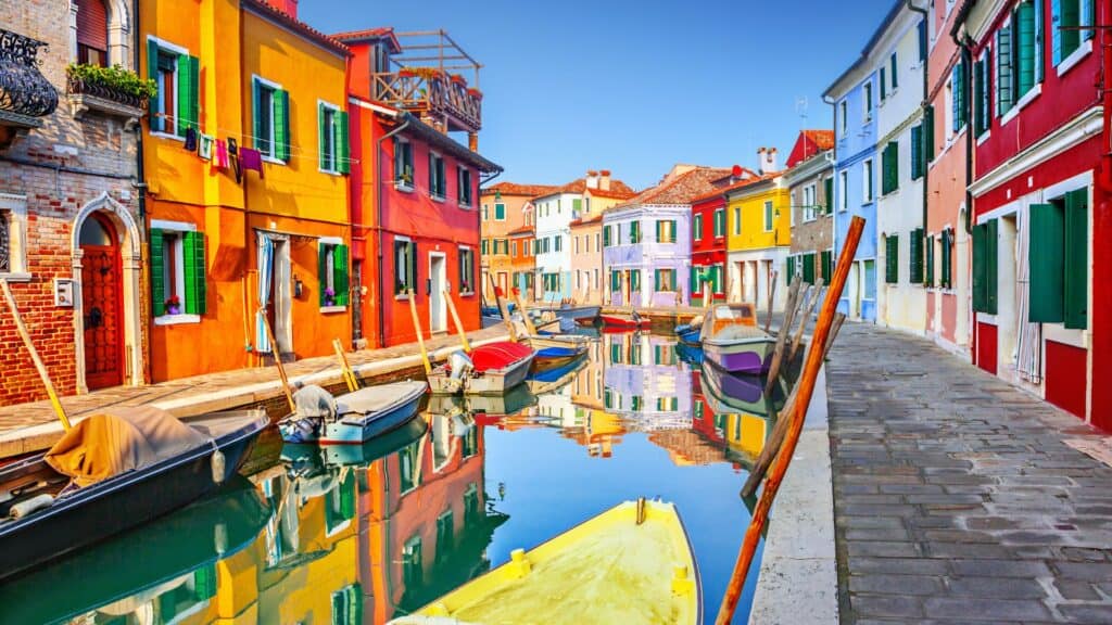 เกาะเล็ก ๆ ที่เต็มไปด้วยบ้านสีลูกกวาดริมคลอง น้ำสะท้อนกับสีสดใสของกำแพงบ้าน กลายเป็นภาพที่โรแมนติก และอบอุ่น Burano ยังขึ้นชื่อเรื่องงานลูกไม้โบราณที่เพิ่มเสน่ห์ความคลาสสิกให้เมืองนี้