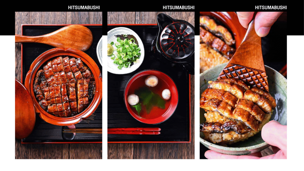 บริการอาหารกลางวัน ณ ภัตตาคาร บริการท่านด้วยเมนู Hitsumabushi ข้าวหน้าปลาไหลนาโกย่า (ฮิทสึมาบูชิ) เพราะเป็นเมนูท้องถิ่นที่มีเอกลักษณ์เฉพาะตัว โดยจะย่างปลาไหลบนน้ำซอสสูตรเฉพาะ ทำให้ได้รสชาติเข้มข้น หอมหวาน และสามารถทานได้หลายสไตล์ในชามเดียว