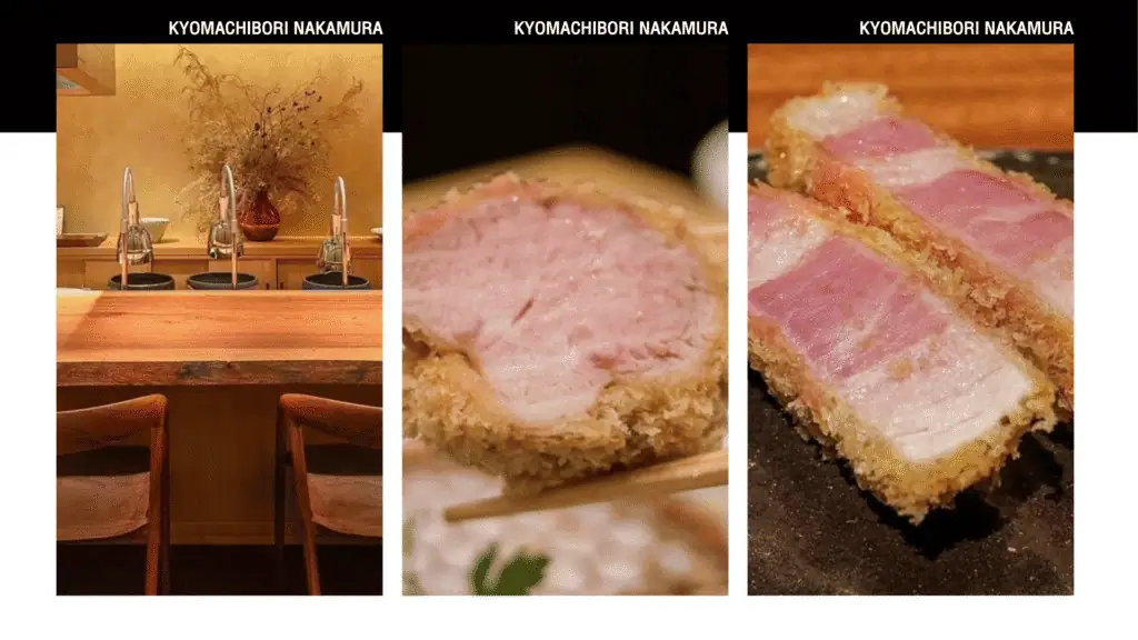บริการอาหารกลางวัน ณ ภัตตาคาร Kyomachibori Nakamura ร้านทงคัตสึระดับพรีเมียมในย่านโอซาก้า ได้รับการแนะนำใน Michelin Guide เสิร์ฟแบบคอร์ส ใช้หมูคุณภาพสูงหลายส่วน เช่น Loin, Fillet, Rare Cut ปรุงทอดแบบพิถีพิถัน