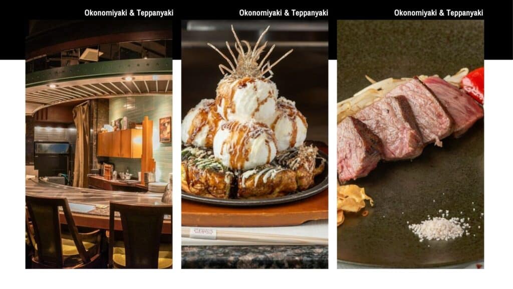บริการอาหารค่ำ ท่านด้วยเมนู Okonomiyaki & TEPPANYAKI สัมผัสประสบการณ์ การยกระดับโอโคโนมิยากิ และ เทปปันยากิ แบบดั้งเดิมของโอซาก้าให้อยู่ในรูปแบบหรูหราและร่วมสมัย ตัวร้านตกแต่งอย่างสง่างาม มีที่นั่งเคาน์เตอร์ล้อมรอบเตา ทำให้ท่านได้ชมฝีมือเชฟขณะทำอาหารแบบสด ๆ ราวกับชมการแสดง “การันตีโดย รายการรอบจานรอบโลก คุณนิรุตต์ ศิริจรรยา”