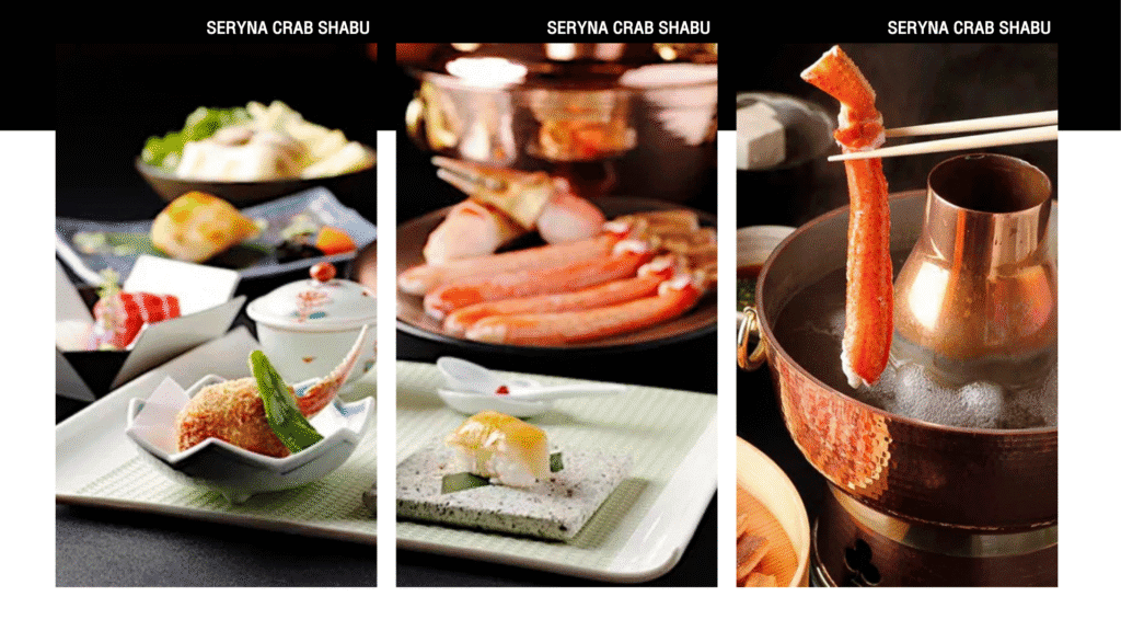 บริการอาหารเย็น ณ​ ภัตตาคาร หรูใจกลางกินซ่าที่ขึ้นชื่อเรื่องชาบูขาปูยักษ์สดหวาน เนื้อแน่นเด้ง จุ่มในน้ำซุปรสกลมกล่อม เสิร์ฟพร้อมซอสงาหอมเข้มและผักตามฤดูกาล ในบรรยากาศเรียบหรูแบบญี่ปุ่น เหมาะสำหรับมื้อพิเศษที่อยากสัมผัสรสชาติปูสดระดับพรีเมียม.