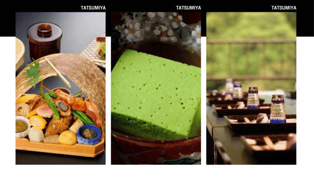 บริการอาหารกลางวัน ณ ภัตตาคาร Tatsumiya เปิดให้บริการมานานกว่า 100 ปี ตั้งแต่ปี ค.ศ. 1913 เป็นต้นมา พัฒนาสู่การเป็นร้านอาหารระดับตำนานที่สืบทอดสูตรและรสชาตแบบดั้งเดิมของเกียวโต เสิร์ฟอาหารในสไตล์ เกียวโตไคเซกิ (Kyoto Kaiseki) ซึ่งเปี่ยมไปด้วย ความงดงามและความประณีต