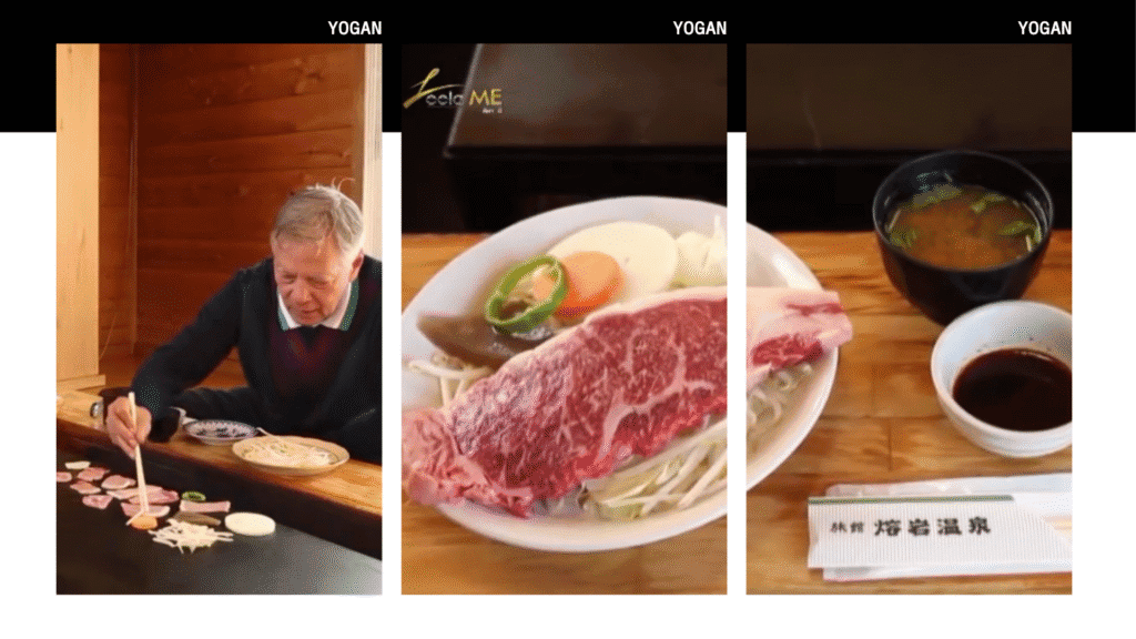 บริการอาหารกลางวัน ณ ภัตตาคาร YOGAN ลิ้มรสหมูย่างหินภูเขาไฟ เมนูดังแห่งคาวากูจิโกะ ที่ใช้แผ่นหินลาวา นำมาทำเป็นกระทะ ทำให้เนื้อสุกเร็วกว่าปกติ เป็นมีกลิ่นหอมเฉพาะตัว นอกจากเนื้อหมูแล้ว ยังมีเนื้อวัวคุณภาพเยี่ยม รวมถึง ซีฟู้ด หอย กุ้ง พร้อมผักนานาชนิด ที่ทางร้านได้คัดสรรมาเป็นอย่างดี