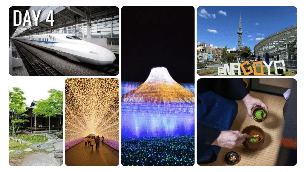 นำท่านนั่งรถไฟความเร็วสูง ชินคังเซน เดินทางสู่ นาโกย่า ใช้เวลาโดยประมาณ 1.30 ชั่วโมง ชินคันเซ็น SHINKANSEN แปลได้ว่า เส้นทางไกลสายใหม่ โดยมีประวัติยาวนานกว่า 50 ปีแล้ว รูปร่างของรถไฟชินคันเซ็นมีความแปลกตา ด้วยลักษณะหัวแบบกระสุน จึงมีอีกชื่อว่า รถไฟหัวกระสุน BULLET TRAIN เดินทางถึงเมืองริมทะเลอันเป็นเมืองใหญ่ที่สุดของภูมิภาคนี้