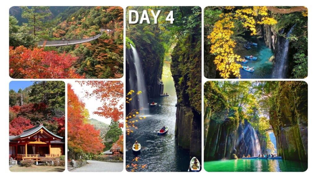 นำท่านล่องเรือชมความงดงามของ หุบเขาทะคะจิโฮะ (Takachiho Gorge) หน้าผาสูงชันเฉลี่ย 80 เมตร ทอดตัวกว่า 7 กิโลเมตร สร้างทิวทัศน์ธรรมชาติที่ตระการตา เพลิดเพลินกับการพายเรือผ่านผาหินและน้ำตกท่ามกลางบรรยากาศเงียบสงบ สัมผัสพลังแห่งธรรมชาติที่มอบความรู้สึกผ่อนคลายและสดชื่นราวกับได้รับการชำระล้างหัวใจ