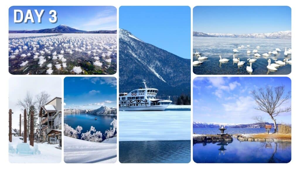 นำท่านชม ทะเลสาบคุชชาโระ (Lake Kussharo) ทะเลสาบปล่องภูเขาไฟขนาดใหญ่ที่สุดในญี่ปุ่น รายล้อมด้วยภูเขาไฟและธรรมชาติอันอุดมสมบูรณ์ เพลิดเพลินกับทิวทัศน์ทะเลสาบรูปหัวใจสุดงดงาม ไฮไลต์ฤดูหนาวคือการได้พบฝูงหงส์ขาวไซบีเรียน (Swan Lake) ที่บินอพยพมาพักอาศัยบนผิวน้ำอุ่นจากพลังความร้อนใต้พิภพ พร้อมผ่อนคลายกับจุดแช่เท้าออนเซ็นธรรมชาติริมทะเลสาบ ท่ามกลางวิวภูเขาและสายน้ำอันเงียบสงบ